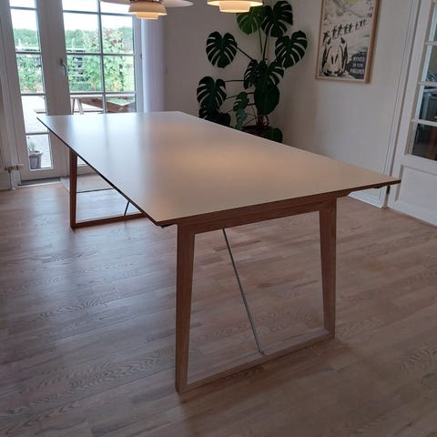 Skovby spisebord i utroligt flot stand og med 2 tillægsplader. Massiv bøg behandlet med hvidolie.