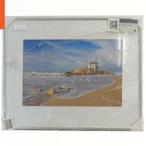 Denne billedramme indeholder et broderet motiv af en kirke og et landskab med huse og træer. Motivet er farverigt, med en dominerende blå himmel og røde tagflader. Rammen er lavet af lyst træ og har en klar glasforside, der beskytter broderiet. Der er en ophængsmekanisme på bagsiden, hvilket gør den klar til ophængning.
