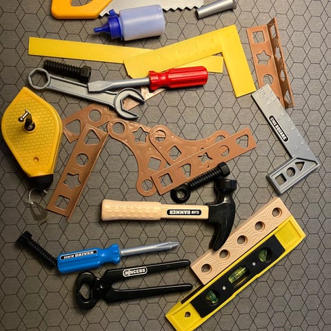 Dette legetøjsværktøjssæt indeholder en samling af forskellige stykker legetøjsværktøj inklusiv en sav, tang, skruenøgle og en batteridrevet boremaskine. Sættet inkluderer også en gul sikkerhedshjelm. Beregnet til børn, dette sæt giver dem mulighed for at lege med realistisk udseende værktøjer, der er lavet af plastik. Størrelsen på legetøjsværktøjet er typisk omkring 25 cm.