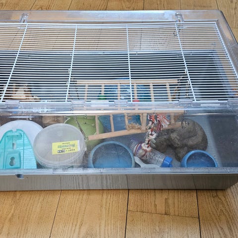 Stort og lækkert bur til hamster sælges. Der er også hjul (20cm, nærmest lydløst), huse, transportboks mm. Det er brugt men er perfekt til at huse en lille ny beboer.