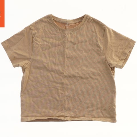 En kortærmet T-shirt i en beige farve med et diskret mønster. T-shirten har en rund halsudskæring og er fremstillet i et let materiale, velegnet til hverdagsbrug.