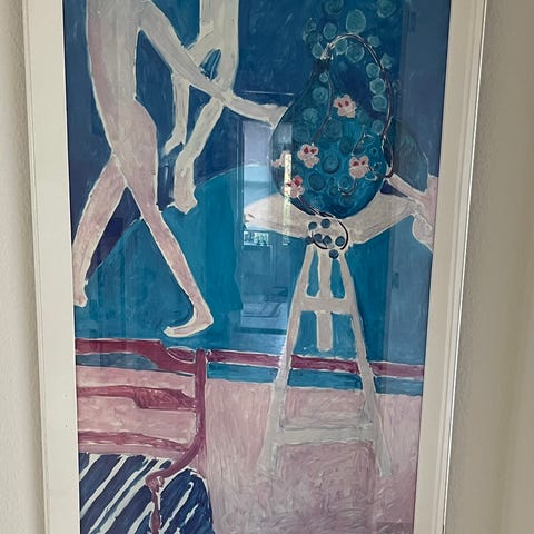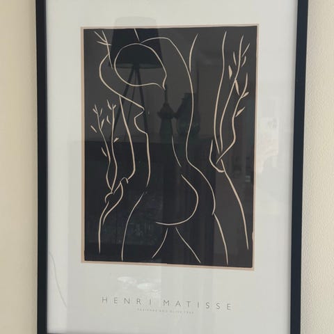 Henri Matisse plakat med et kunsttryk af en blå figur i en abstrakt positur. Plakaten er indrammet ved en professionel i en sort aluminiums ramme.