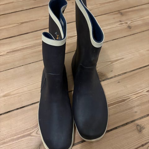 Et par McKinley gummistøvler i mørkeblå med lyse såler. Støvlerne er fremstillet af vandtæt materiale og er ideelle til regnvejrsdage. De er i størrelse 34 og har en enkel og praktisk design med en trækstropp bagpå til nem påtagning. Der er et logo mærkat på siden af støvlerne. Tag: gummistøvler, McKinley, regnvejrsdage, vandtæt, fodtøj.