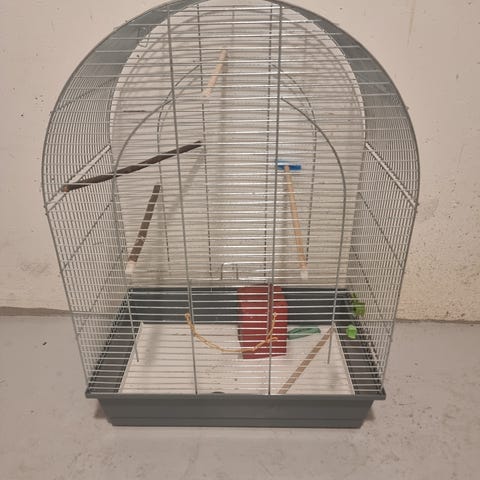 Træ fuglebur i mørkebrunt med gitterelementer. Buret har en rektangulær bund og buet top, samt en låge til adgang. Egnet til små fugle.