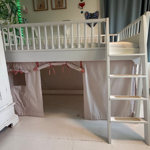 Vi har købt sengen brugt for ca 2 år siden - vores datter mener nu hun er for stor til højseng🤪 Den er stadig super fin med enkelte hakker - se billeder. Obs - den ene stolpe gaber en smule i den ene samling - se billede 8. Lidt lim kan nok fikse det☺️