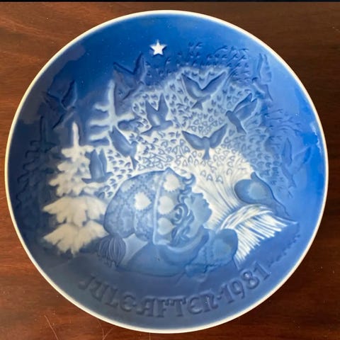 Juleplatte fra Bing og Grøndahl 1981. Vi skal huske de små fugle i vintertien. Ø18 cm. Du kan loppesjoppe den for 50 kr.