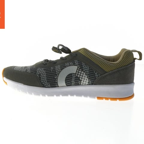 Et par blå sports løbesko med grøn og hvid sål. Der står 'SOFTSHELL' på siden af skoene, og snørebåndene er elastiske med en plastiklukning. Skoen er designet til at være let og komfortabel.