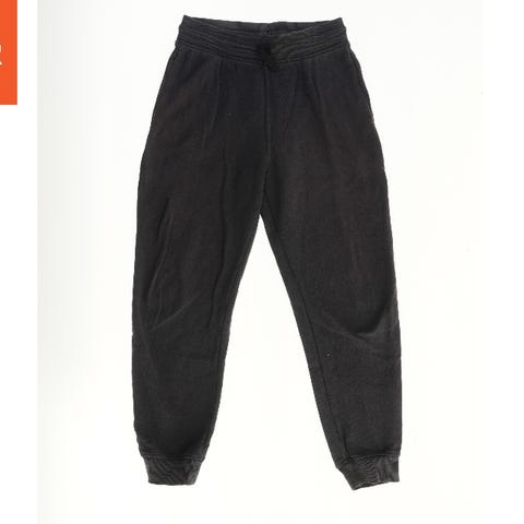 Et par grå sweatpants med sorte detaljer såsom lynlåse på lommerne. Bukserne har ribkant ved anklerne og snøre i taljen. Der er en baglomme uden lynlås.
