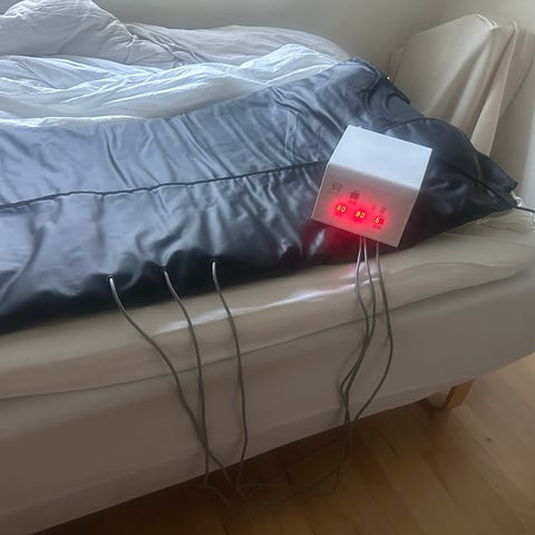 Dette er et infrarødt sauna tæppe designet til wellness og afslapning. Det kommer i en mørk lilla farve og er udstyret med en kontrolenhed samt en fjernbetjening, der muliggør indstillinger af temperatur og tidsstyring. Produktet har tilslutninger til strøm via en stikkontakt og ledninger. Brugt tre gange.