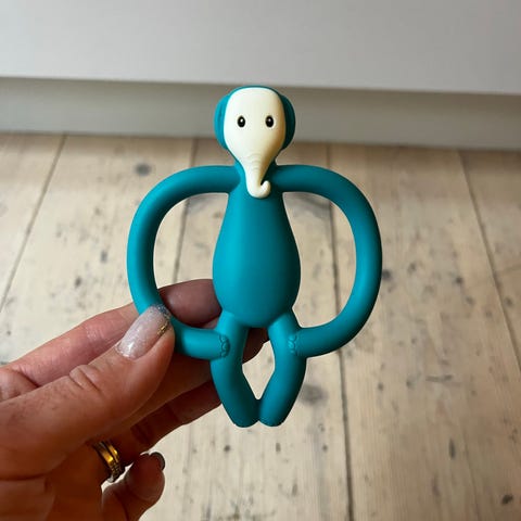Bidering lavet af træ med et garnbundet hjortehoved. Bideringen er let og har en diameter på 8 cm, perfekt til små hænder. Garnet er brun og hvid, med små detaljer som øjne og næse broderet. Bideringens overflade er glat og naturlig. Mærket er påsyet på hjortehovedet.