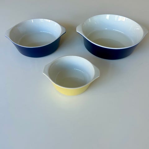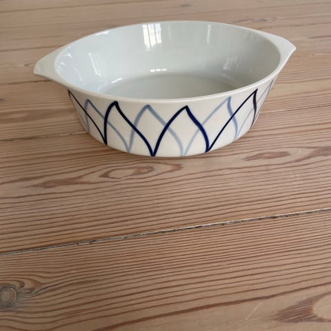 Meget flot og klassisk ovnfast skål med håndtag og låg fra Lyngby med smuk blåbær mønster.