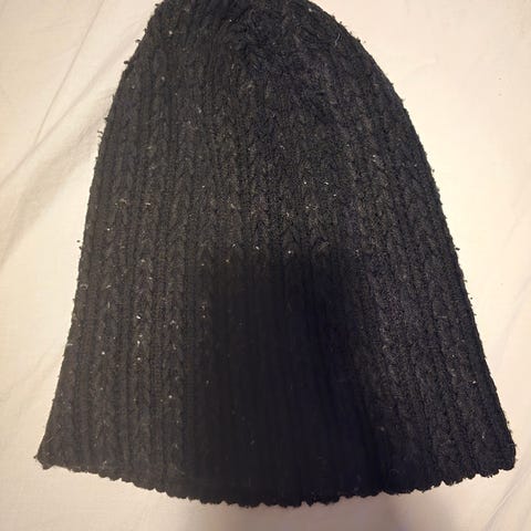 Dette er en strikket hue i en dyb rød farve, der har tre sorte knapper foran. Huen har en diameter på Ø 23 cm. Den er designet til at være komfortabel og varm, ideel til koldere vejr.