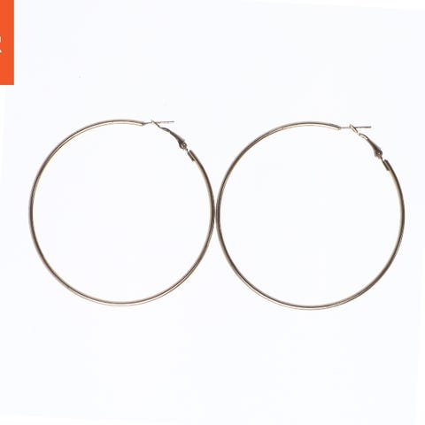 Et par guldbelagte øreringe med en diameter på 2 cm. De er cirkelformede med en glat overflade og dekoreret med en række små klare sten langs den ene side.