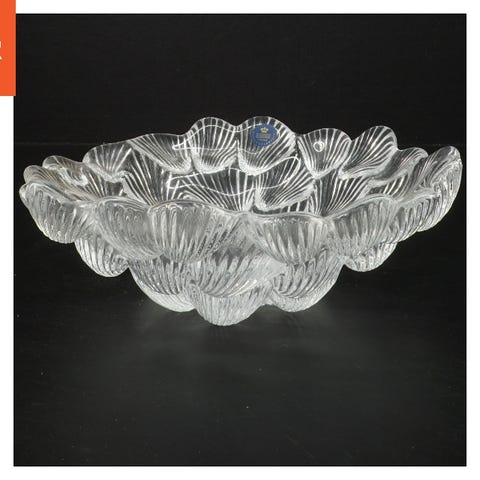 Skål i krystalglas med bølgede kanter og et klassisk udseende. Den har en diameter på 10 cm og er med et mærke, der angiver 'Royal Copenhagen Crystal'. Skålen kan bruges til servering eller som dekoration.