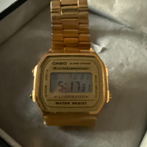 Casio digital ur til unisex med stålrem og digitalt positiv display. Uret har en firkantet urskive med sort baggrund og lysfunktion. Remmen er en mesh-ståltype med lås.