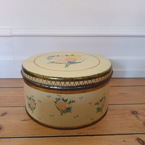 Vintage kagedåse med blomsterdesign (str. 21x18 cm)