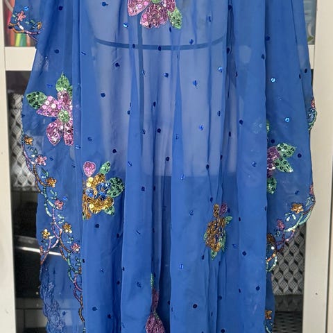 Dette er et rødt sjal dekoreret med et mønster af sølvfarvede mønter og små perler. Sjalet måler 120 cm i længden. Det kan bruges som tilbehør til dans eller andre festlige anledninger.