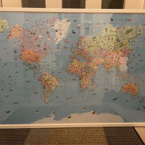 Dette er et farverigt illustreret verdenskort, der viser forskellige dyr placeret på deres respektive kontinenter og havområder. Kortet er placeret i en sort ramme og har en størrelse på 52x42 cm. Bagsiden af rammen er udstyret med beslag til ophængning.