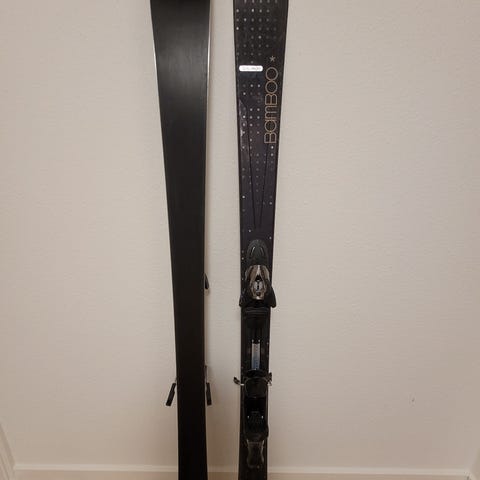Salomon Bamboo dame/pige ski med en længde på 155 cm. Skiene har monterede bindinger og er designet til alpint skiløb. Farven på skiene er primært sort med mønstre i brune og turkise nuancer. Et stykke metal i fronten er blevet afmonteret, men ingen betydning for skiløbet.