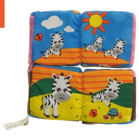 Baby sensory blanket in pink color with various tags and textures around the edges. The blanket features a soft material suited for infants and measures 26x24 cm. Suitable for tactile exploration and comfort for babies.