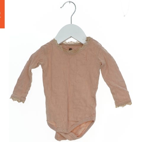 En lyserød bodystocking med langærmede og mørkegrå kanter ved halsen, håndleddene og benåbningen. Foran er der et print af en kanin med lange ører og et hjerte på maven. Bagsiden er ensfarvet uden print.