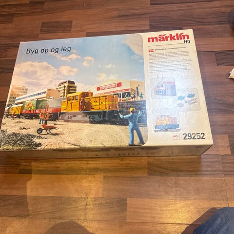 Et sæt bestående af modeltog og skinner fra Märklin, en kendt producent af modeljernbaner. Sættet indeholder flere skinner (22 stk buede, 35 lige, 12 små, 4 sporskifter, 1 jernbaneoverkørsel). Desuden er der diverse komponenter til modeltog, såsom tre lokomotiver og forskellige vogne (herunder biltransport, carlsbergvogn, 2 fladvogne og en tipvogn) samt kabler og tilbehør. Alt er opbevaret i en brun plastik kurv. Tags: modeltog, jernbanesæt, Märklin