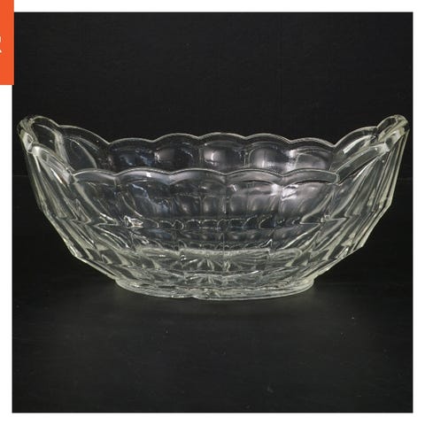 Transparent glasfad med rillet design på siden og en glat overflade indeni.