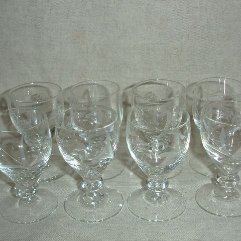 Sæt af seks Holmegaard Bygholm portvinsglas. Glasene har et traditionelt design med en bred bund og et kort stilk. Der er dekorative graveringer på hvert glas, som forestiler kornsorten byg.