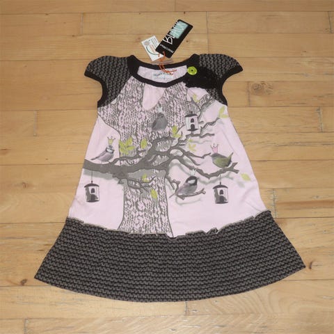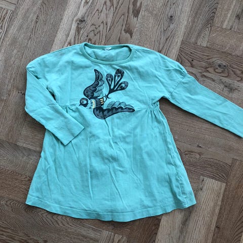 Langærmet kjole med brede vandrette striber. Kjolen har en rund halsudskæring med en knapdetalje. Farverne er blå og grøn med bordeuxfarvede bånd ved kanterne. Der er også kantdetaljer ved lommerne. Kjolen er i blødt velour.
