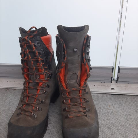 Husqvarna skære gummistøvler i størrelse 45 med orange og sort farve. Støvlerne har en slidstærk gummiydre og en justerbar snøre i toppen for bedre pasform. Velegnede til udendørs brug i våde og mudrede forhold.