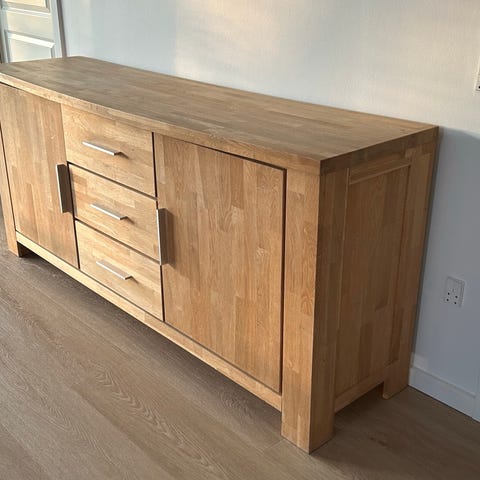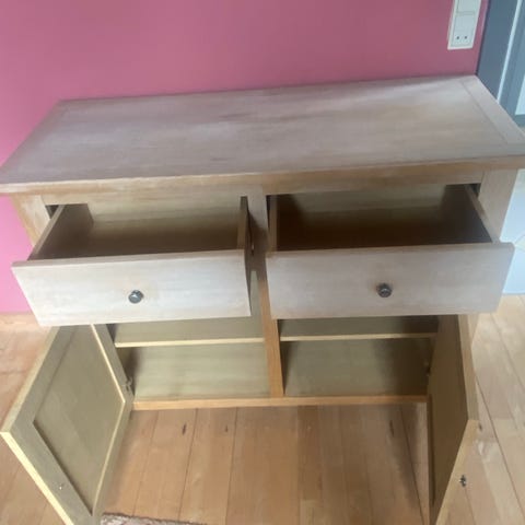 God opbevaringsplads bag lågerne – perfekt til stue eller spisestue. Fremstår pæn og velholdt.