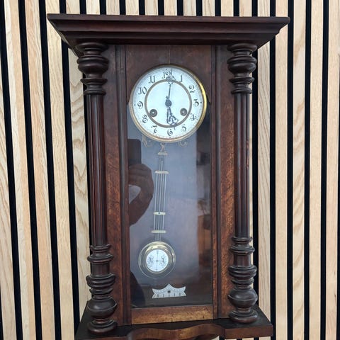 Vægur med pendul i træ. Uret har en rund urskive med sorte tal på hvid baggrund og pendul i messingfarvet metal. Designet i klassisk stil med detaljer i træ.