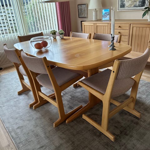Flot teak træ spisebord med 6 flotte brune læder stole til.
