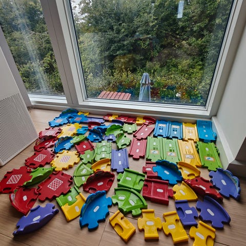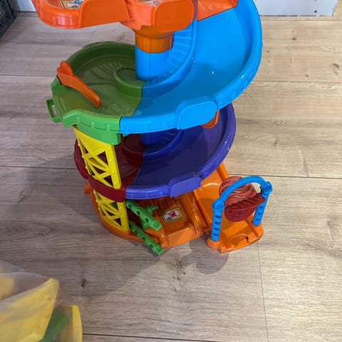 Godt brugt bilbane fra Vtech med to kørebaner, tankstation med lyd og lys (virker) og parkeringsplads.