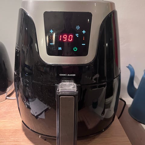 Cook & Baker Airfryer med rotisseriefunktion. En køkkenmaskine designet til stegning med varmluft og mulighed for at tilberede mad med roterende spyd. Udstyret med digitalt display og forskellige funktioner til tilberedning af mad.