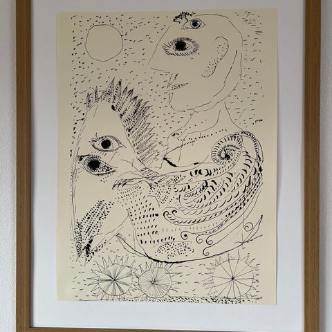 Figurationer i sort og blå på hvid/cremefarvet baggrund