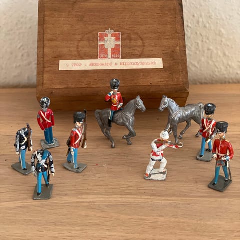 To ryttere og 4 fodtusser i (antager jeg) originalæske fra fra Juveler& Guldsmed Kar. B. Krogh, Pilestræde 48. Æsken er slidt og det er figurerne også. Benet på den ene hest har vist været knækket og er blevet pænt limet. Skal afhentes i Valby eller kan overdrages i København.