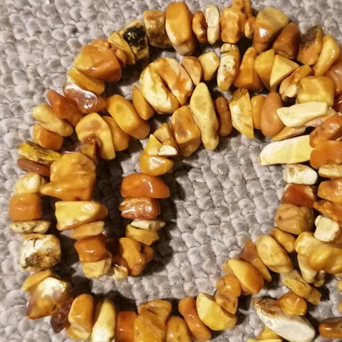Rav-ben halskæde til kvinde fremstillet af ravmateriale. Halskæden består af flere runde ravperler i forskellige nuancer af gul og brun. Passer til brug som smykke til kvinder.