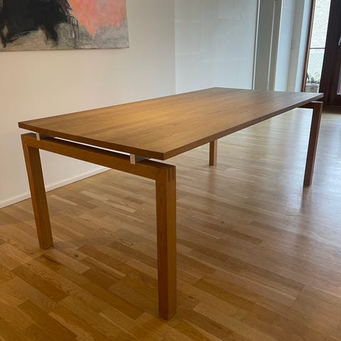 Christina Strand og Niels Hvass. Straight spisebord i eg med to tillægsplader i grå laminat, L. 190 cm. B. 95 cm. H. 72 cm. Tillægspladerne er hver 55 cm, hvorfor bordets længde kan blive op til 300 cm. Produceret hos Tranekær Furniture med mærkat herfra.