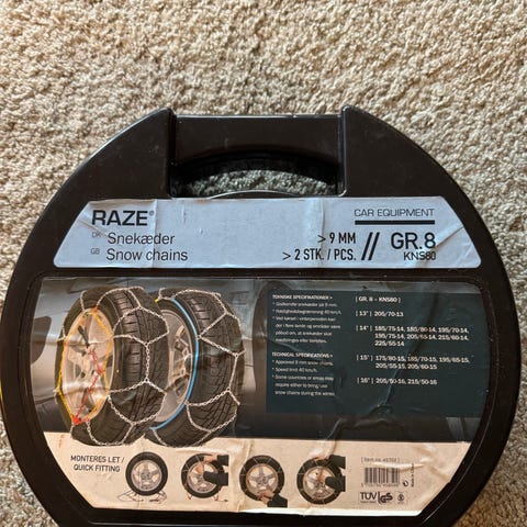 Raze 240 sneekæder med 16 mm ledstørrelse. Passer til dækstørrelser fra 215/80-15 til 255/45-19. Leveres i rød opbevaringspose. Brugt 1 gang