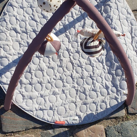 Bright Starts aktivitetstæppe og stativ med ophæng og legetøj.