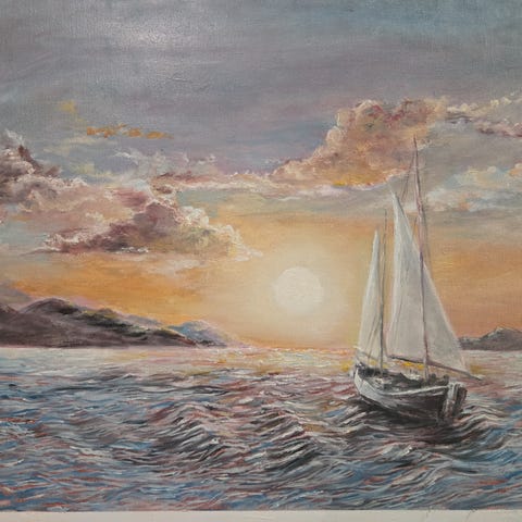 Maleri med motiv af et skib på havet med flere planeter på en blå baggrund. Maleriet har en firkantet form og fremviser en kombination af varme og kolde farver.