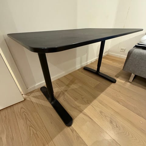 IKEA bord i sort farve med rektangulært bordplade og to ben i metal. Bordet har en enkel og funktionel konstruktion. Man kan justere højden på benene