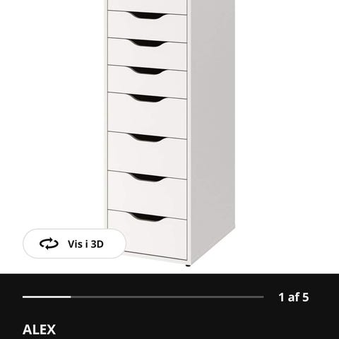 IKEA Alex kommode med 9 skuffer i hvid farve. Kommoden mangler en fod bagerst (der er normalt 4 fødder)