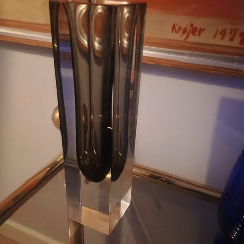 Muranovase i gul farve med sort mønster. Vasen har en rund form med en smal åbning i toppen. Der er et skår ved åbningen som ses på billede.