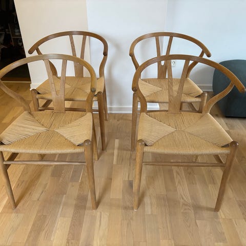 5 stk. af den klassiske Y-stol designet af Hans J. Wegner sælges. Stolen er udført i massiv sæbebehandlet bøg med det karakteristiske håndflettede sæde i naturpapirgarn.