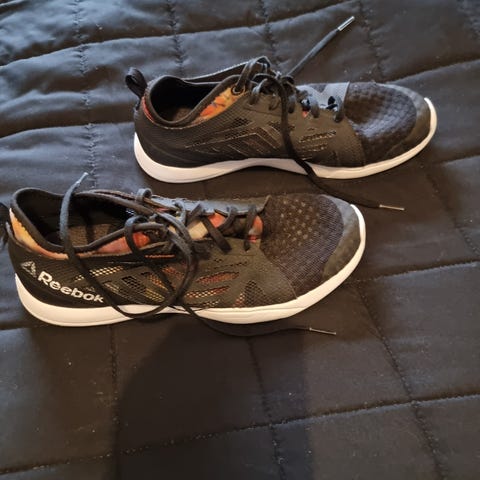 Reebok dansesko i størrelse 39. Skoene er røde og designet til dans. Materialet fremgår ikke, men skoene har snørebånd og er velegnede til dans.
