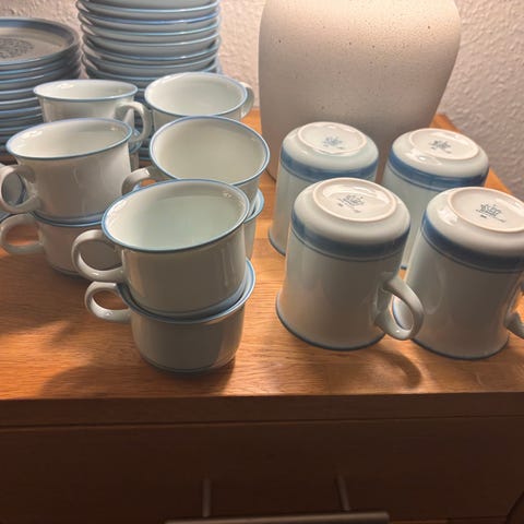 Stellet er dækket med en silkeblød glasur og håndmalet med en lys almueblå farve lagt under glasuren. Stellet er ovnfast.
