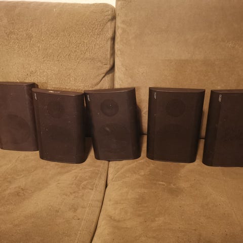 To Jamo surroundsound bag-/satellithøjtalere. Fin stand og fungerer som de skal. Kabler medfølger ikke.