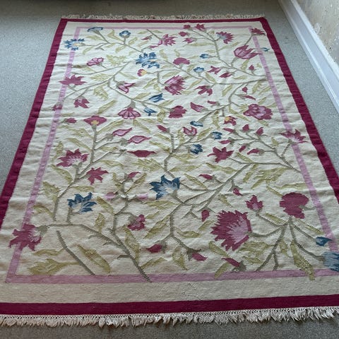 Tæppe i rødbrune nuancer med mønster og frynser. Tæppet har en rektangulær form og viser et traditionelt mønster. Det er velegnet som gulvbelægning i forskellige rum. Længde 204 cm, bredde 126 cm. N